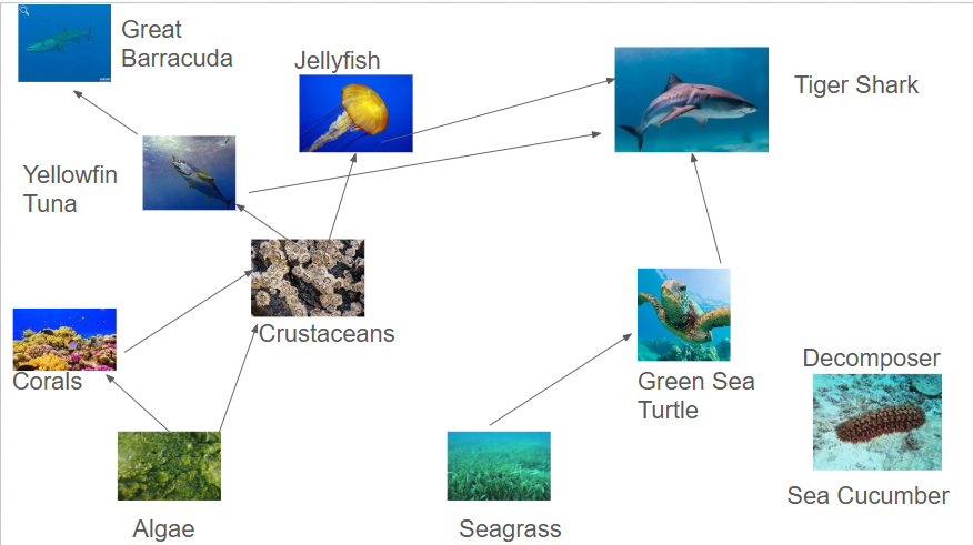 The Red Sea reefs is an ecosystem that is home to a large amount of organisms. These vary from producers, consumers, and decomposers. In the food web shown, it can be seen that there are two organisms on the bottom. These organisms are producers, meaning they can produce their own food, some examples are seagrass and algae. Going up on the web you can spot the primary consumers such as crustaceans, green sea turtles, and corals, these organisms feed off of the producers. Yellowfin tuna, moon jellyfish, and tiger sharks fall into the secondary consumers category, which eat the primary consumers. Although the tiger shark is one of the secondary consumer of the food chain on the right, it is also an apex predator and is on top of the food web besides the barracuda. Lastly, as you may have noticed on the side of the energy web there is an organism called the sea cucumber, this is an example of a decomposer living in the Red Sea reefs. A decomposer breaks down dead organic matter and releases nutrients back to the environment. Producers such as seagrass and algae take these nutrients to make new organic matter and restarting the flow of energy through the web.